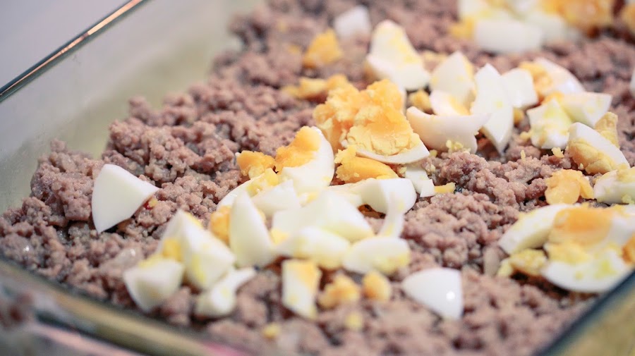 He cortado los huevos duros en trocitos y los he puesto por encima y por último, el resto de puré de patata, intentando cubrir toda la superficie.