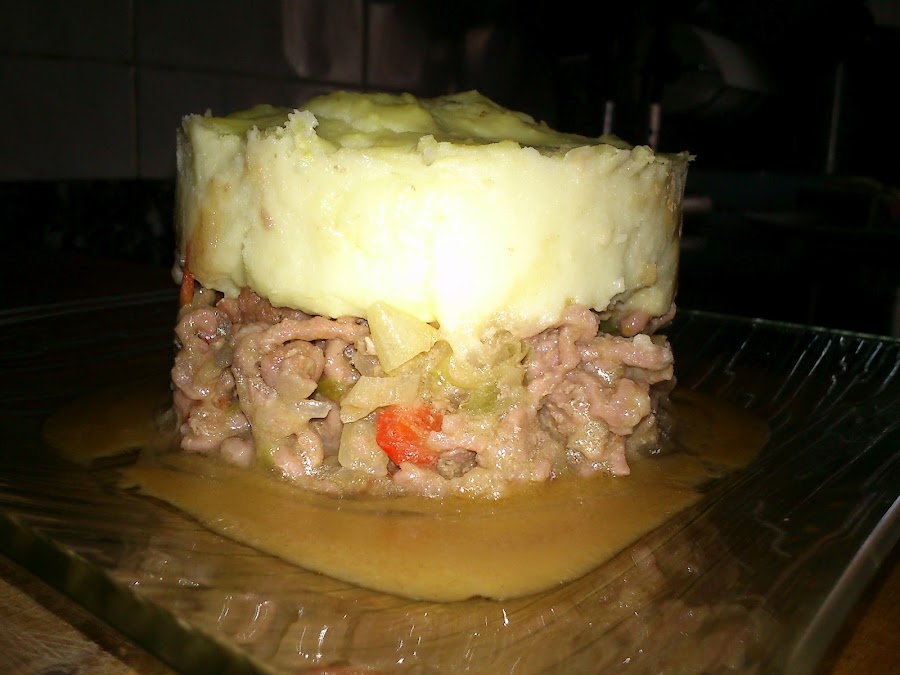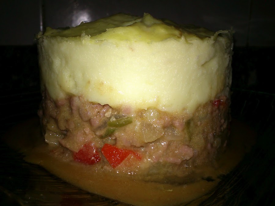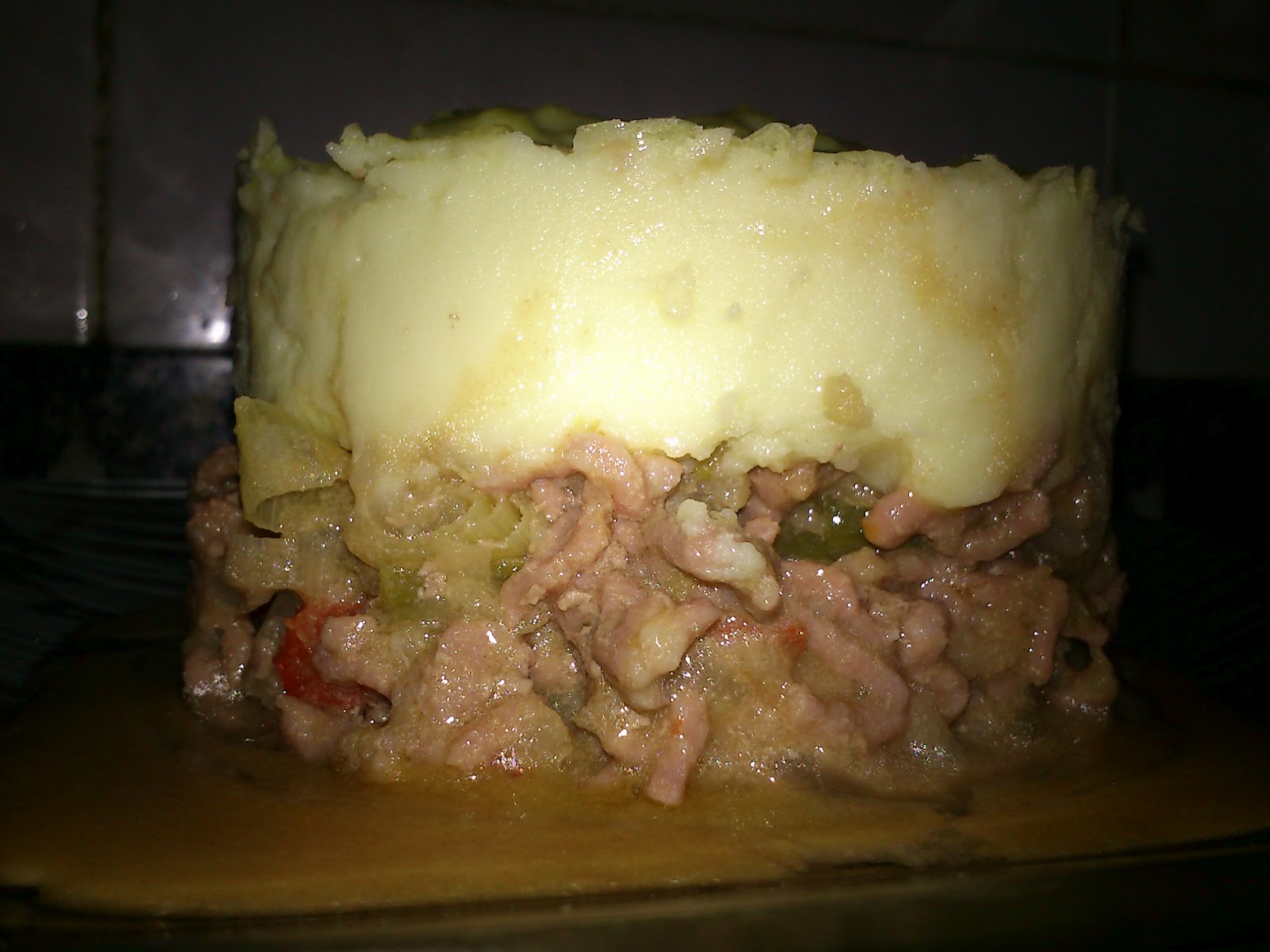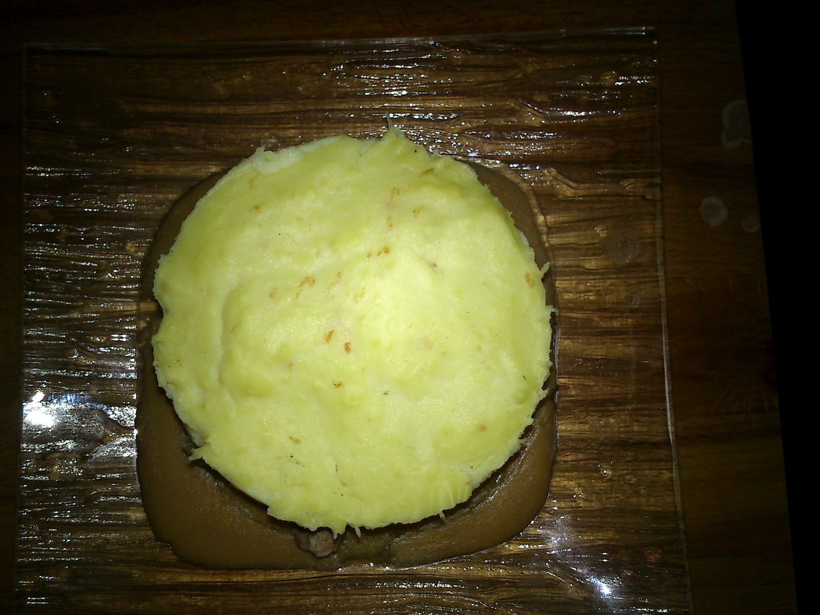 La carne con el tomate, la ponemos como fondo de una cazuela o molde, y mientras hacemos el pure de patatas como viene en el paquete, o lo podeis hacer casero.
