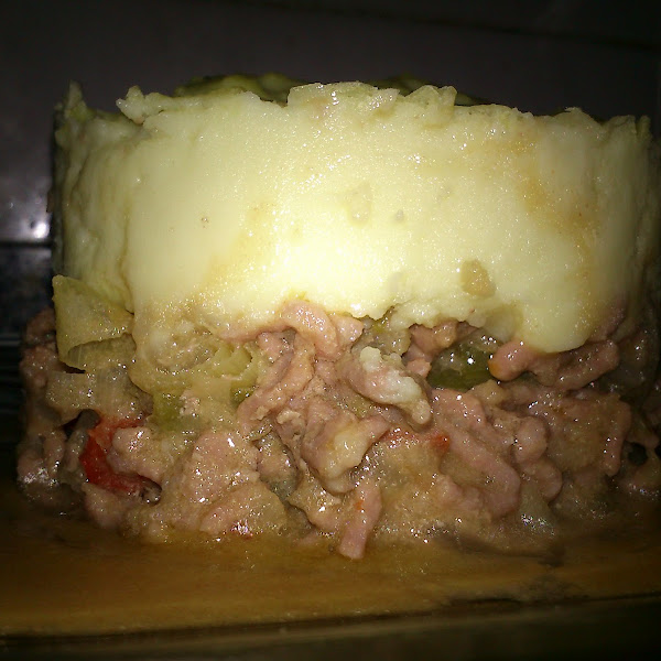 Encima echamos el pure de patatas.Y para finalizar echamos el queso parmesano.