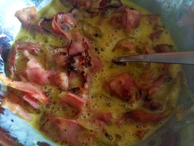 Batimos en un bol los huevos con la nata (crema de leche) líquida y añadimos todos los ingredientes (cebolla caramelizada y bacon y unos trozos al gusto de queso rulo de cabra) , mezclamos y vertemos sobre las hojas que tenemos en el molde (recordad que los bordes de las hojas deben quedar hacía fuera).