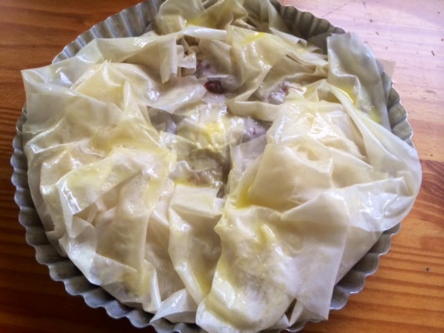 Ahora haremos una "tapa" para el pastel, colocando un par de hojas previamente pinceladas de mantequilla deterrida encima del relleno para tapar el pastel y doblamos hacia el centro todos los bordes de las hojas de pasta brick que hemos utilizado como base del pastel cerrando de esta manera todo el pastel.