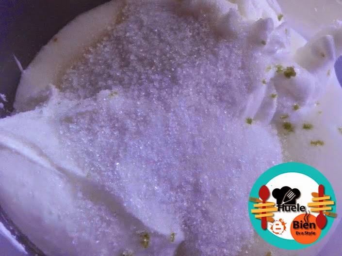 1.- En un bol ponemos el aceite, el azúcar, el zumo de limón y los huevos. Batimos con la batidora hasta que el azúcar se haya fundido completamente.