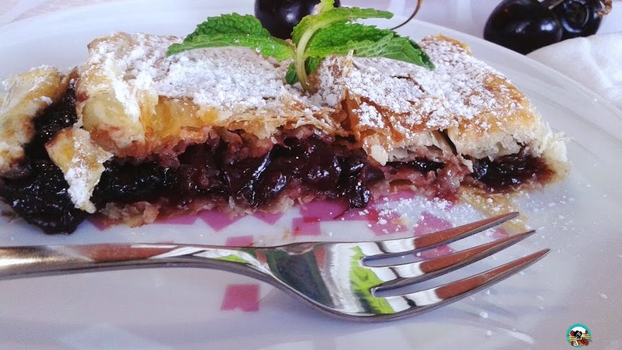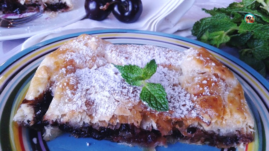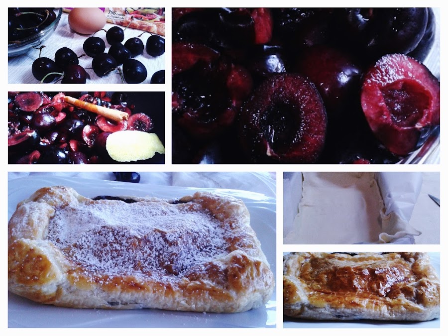 Comienzo la semana con un rico pastel de hojaldre y cerezas. Muy sencillo y con pocos ingredientes...Estamos en temporada de cerezas, por que están en su punto de maduración y son muy económicas.