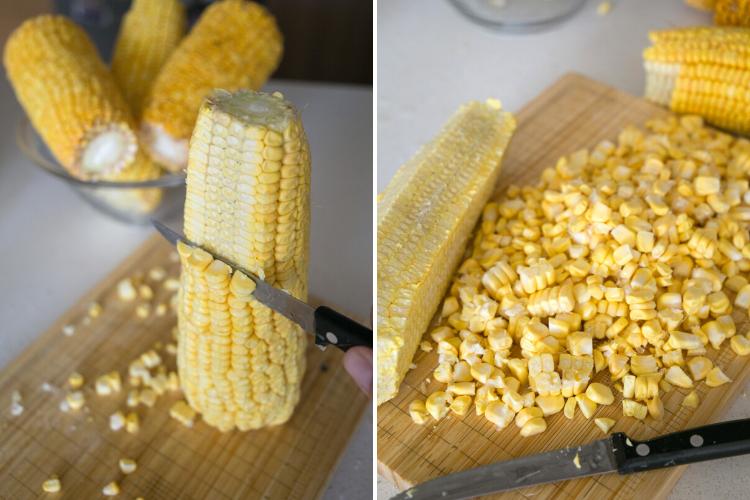 Pelar los choclos y asegurarse de sacar bien los residuos de hojas y pelos. Desgranar los choclos con la ayuda de un cuchillo (usar con con bastante filo o uno con serrucho) y poner los granos en un bowl o recipiente grande.