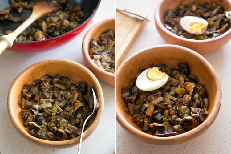 En un sartén o wok calentamos un chorrito de aceite y sofreímos (a fuego medio-alto) unos minutos la cebolla, luego agregamos la berenjena y los champiñones picados. Salteamos unos minutos y aliñamos con sal, comino y merquén. Continuamos salteando un par de minutos más hasta que la mezcla de reduzca a aproximadamente la mitad. Apagamos el fuego y reservamos.