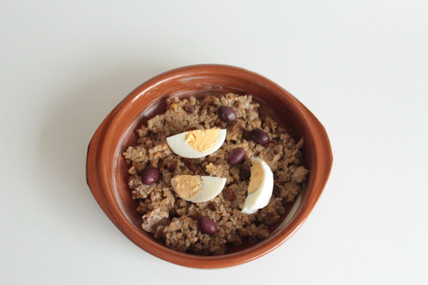 Enmantequillar una fuente apta para el horno y poner un poco de pino o picadillo, luego las aceitunas, pasas y huevos.