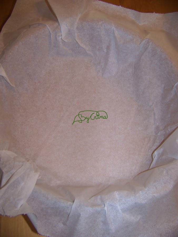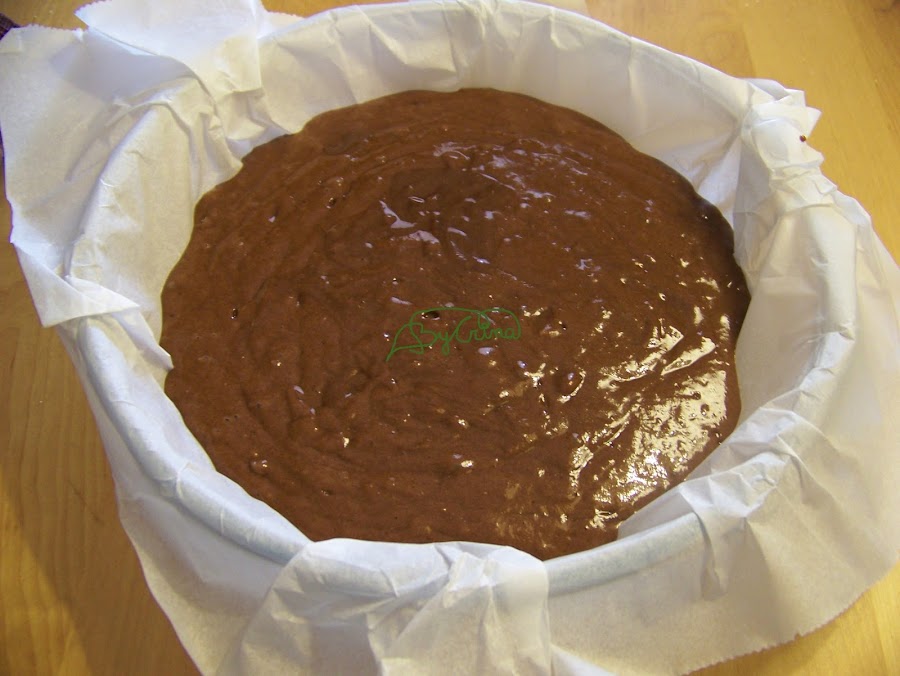 En un recipiente, el de la foto es de 26cm, ponemos un papel de horno (papel vegetal) y añadimos la mezcla