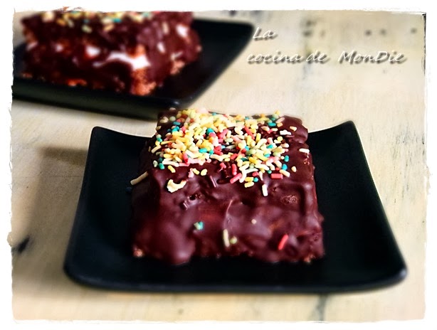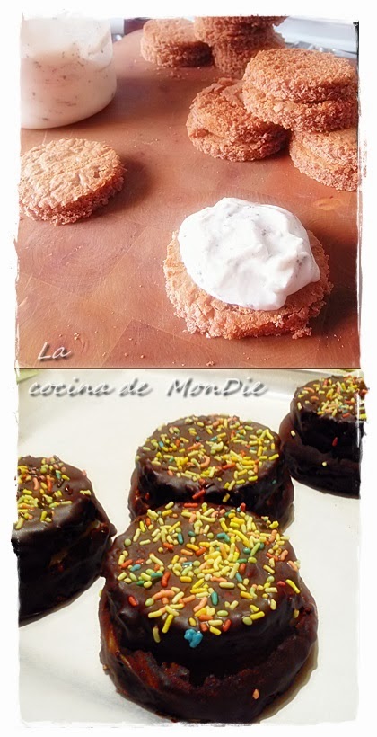 Bañar los pasteles con el chocolate cubriendo bien en la medida de lo posible, por encima poner los fideos de colores y al frigo de nuevo, mi consejo es hacerlos el día anterior, por que el bizcocho queda mas bueno.