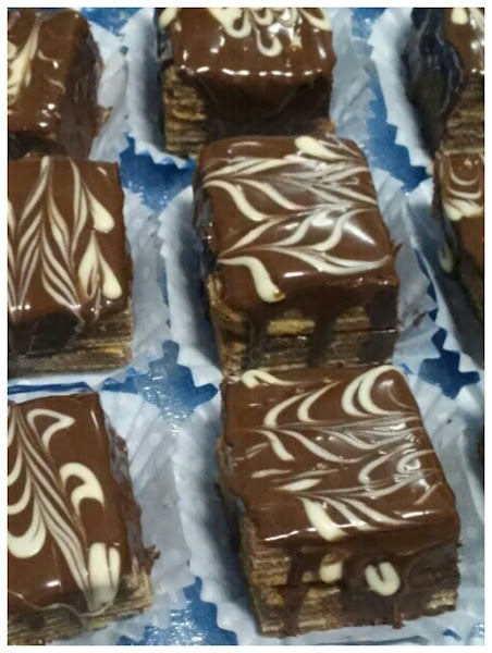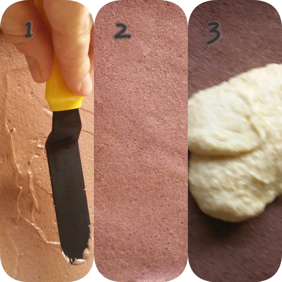 Vertemos una primera capa de vainilla muy fina y la extendemos con una espátula. Horneamos un minuto más o menos ( vuestro horno os irá diciendo el tiempo, puede ser que necesite más. Hemos de ver pequeñas burbujitas que salgan de la masa para saber que está listo para que le pongan otra encima ). Seguimos con una de chocolate, horneamos de nuevo. Sacamos, extendemos, hornemos, y así hasta que nos quedemos sin masa.
