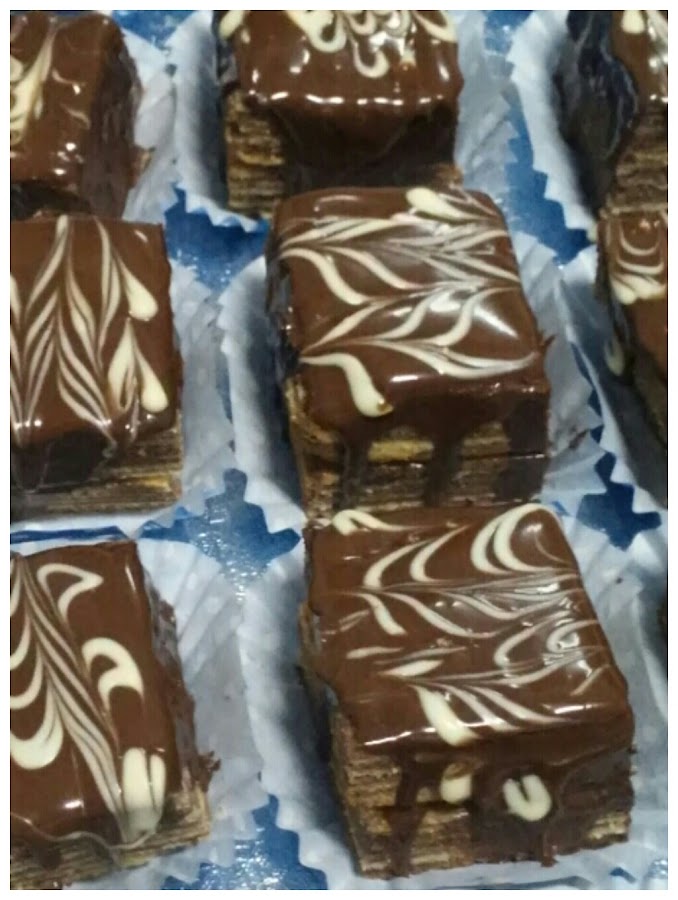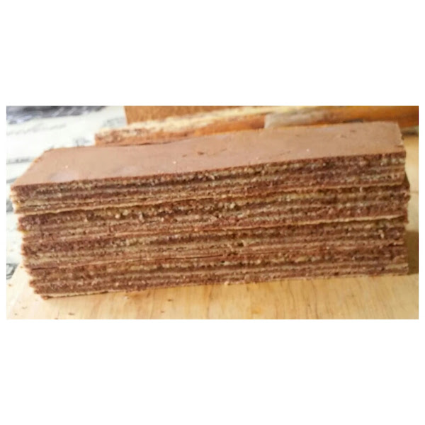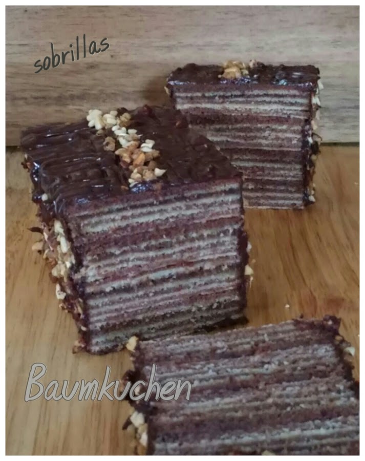 Se trata de hornear al grill finísimas capas intercaladas de bizcocho de vainilla y chocolate y lograr así algo parecido a un pastel de crepes con la diferencia que no necesitan relleno entre capa y capa porque la textura del bizcocho hace que se unan de forma natural. De todas formas yo le he añadido un almibar de chocolate intercalado en alguno de los pisos para que resulte más jugoso.