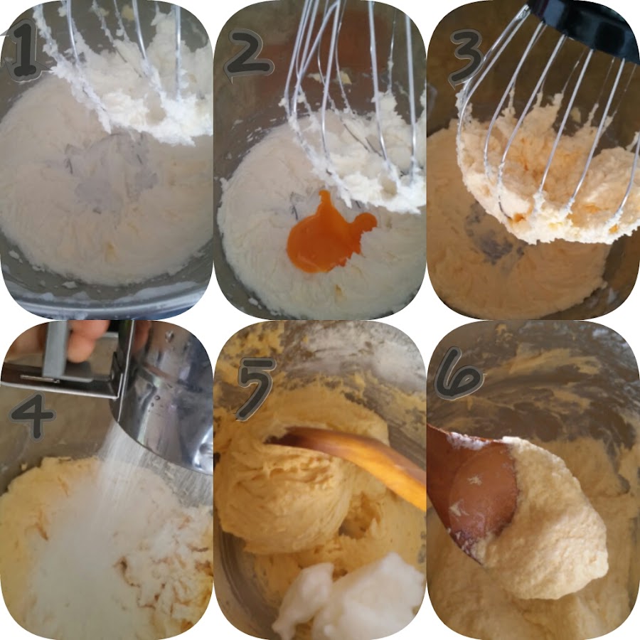 En el mismo bol batimos la mantequilla en pomada con el azúcar hasta que blanquee. Añadimos las yemas de huevo que habíamos reservado. Tamizamos las harinas y las mezclamos poco a poco con la mezcla anterior.