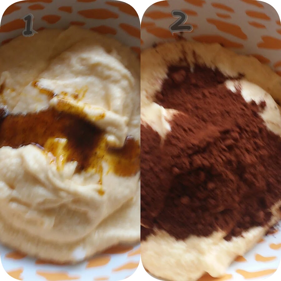 Separamos la masa en dos. A una de las partes le añadimos una cucharadita de pasta de vainilla y a la otra un par de cucharadas de cacao. Mezclamos con cuidado.