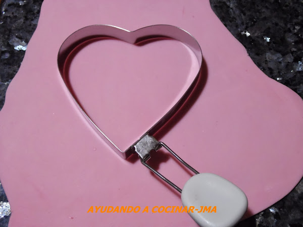Estirar con el rodillo el Fondant y cortar con el molde de corazón. Cortar dos piezas iguales.