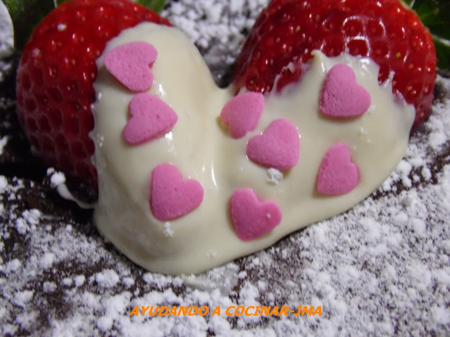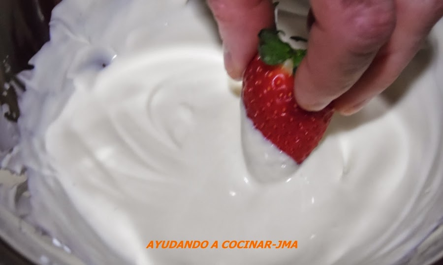 y sobre estos añadir las fresas bañadas en el chocolate blanco que habíamos preparado y reservado.