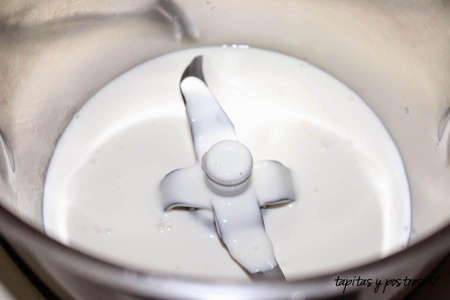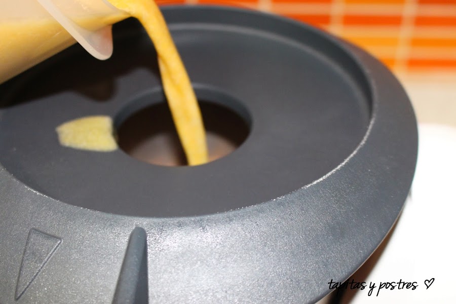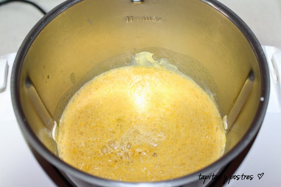 Lavamos el vaso. Ponemos la mantequilla y programamos 8 minutos, 37º, velocidad 1. Añadimos la Coca-cola y programamos 1 minuto, 37º, velocidad 1. Añadimos a continuación la leche y programamos 1 minuto, 37º, velocidad 1. Reservamos esta mezcla en una jarra.