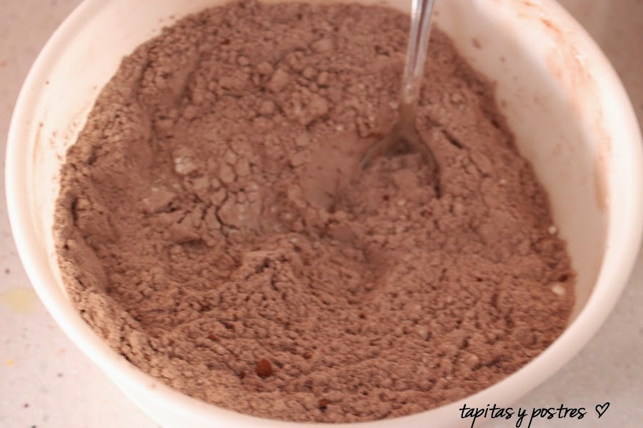 Ponemos los ingredientes secos (azúcar, harina, cacao,bicarbonato y levadura) juntos en un bol y los mezclamos. Reservamos.