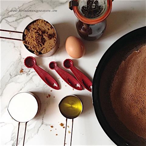 Lo primero, como siempre, precalentar el horno a 180ºC. Preparar un molde cuadrado de unos 20 x 20 cm con mantequilla o aceite desmoldante. Tamizar juntos todos los ingredientes secos (harina, levadura, bicarbonato sódico, cacao, sal) y mezclar junto con el azúcar en un bol. Añadir el huevo, la leche mezclada con el extracto de vainilla y el aceite. Batir después de añadir cada ingrediente. Finalmente agregar el agua hirviendo e integrar toda la mezcla, aviso que quedará un poco líquida, es normal. Verter en el molde y hornear a media altura durante unos 35-40 minutos o hasta que al pinchar el centro con un palito este salga limpio.