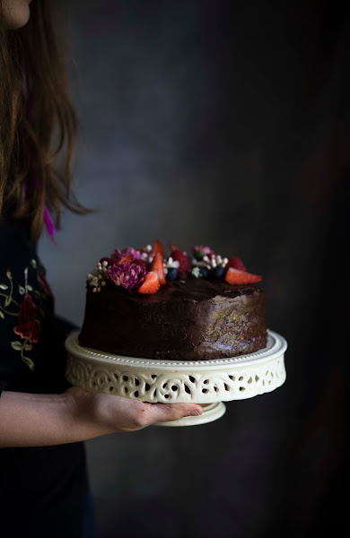 5. Montar el pastel- Se puede dividir cada brownie en dos capas para obtener una mayor altura. En caso contrario, sólo utilizar dos capas. Colocar una base de brownie en el molde, esparcir un par de cucharadas de mermelada y repartirla bien, encima un par o tres cucharadas de ganache de chocolate y esparcirlo bien. Repetir con las otras tres capas de brownie de la misma forma. En la última poner una buena capa de ganache, retirar el molde ( nos ha ayudado a mantener todas las capas alineadas) y repartir el resto de ganache por todos los laterales. Decorar al gusto con frutos rojos y flores comestibles. Mantener en la nevera hasta su consumo.