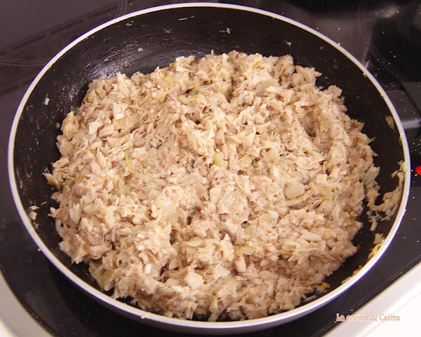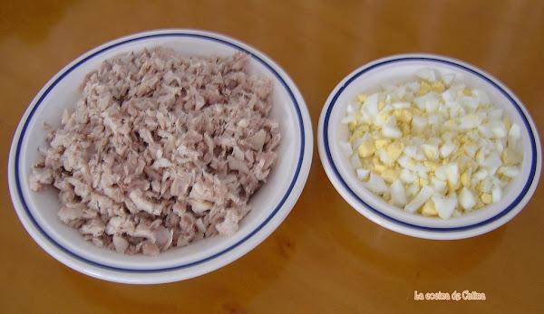 Mientras cocemos el pollo con un poco de agua y sal. Una vez cocido, sacarlo, (reservar el caldo de cocer el pollo), desmenuzarlo picando la carne con un cuchillo.