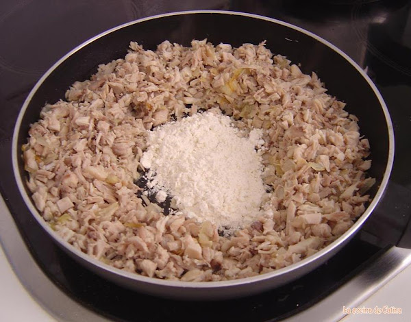 Se pone aceite en una sartén y se fríe la cebolla picadita. Cuando esté pochada, se añade la carne y se mezcla todo bien, poner la cucharada de harina, freír durante algunos segundos y añadir un cucharón de caldo de cocer el pollo y el brandy para que ligue. Lo dejamos enfriar.