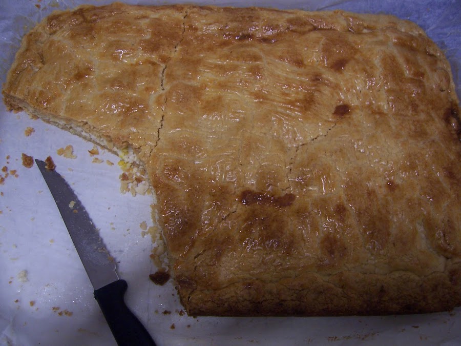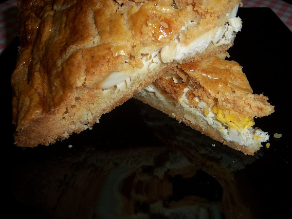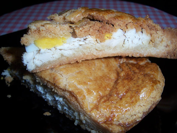 Tapamos con la otra mitad de la masa y cerramos los bordes, pintamos de huevo e introducimos al horno a 180º de una hora y cuarto a una hora y media