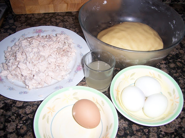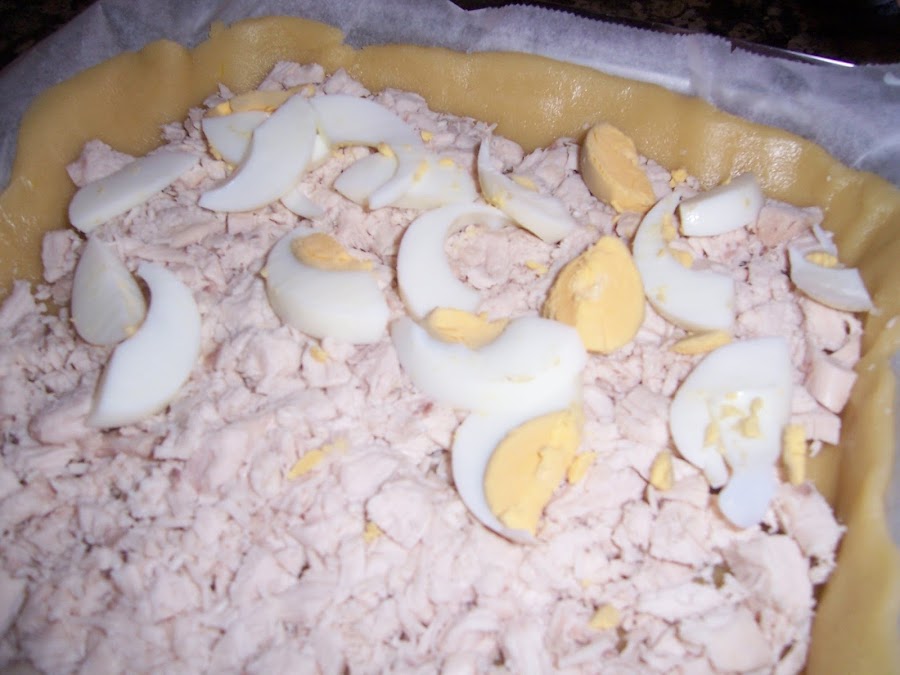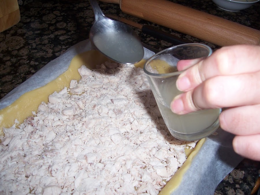 Rellenamos con el pollo cocido y desmenuzado y le añadimos 1/2 vasito de caldo para que nos quede jugoso, pero sin pasarse con el caldo si no la parte de abajo de la masa no se nos haría bien, y cubrimos con el huevo duro en rodajas.