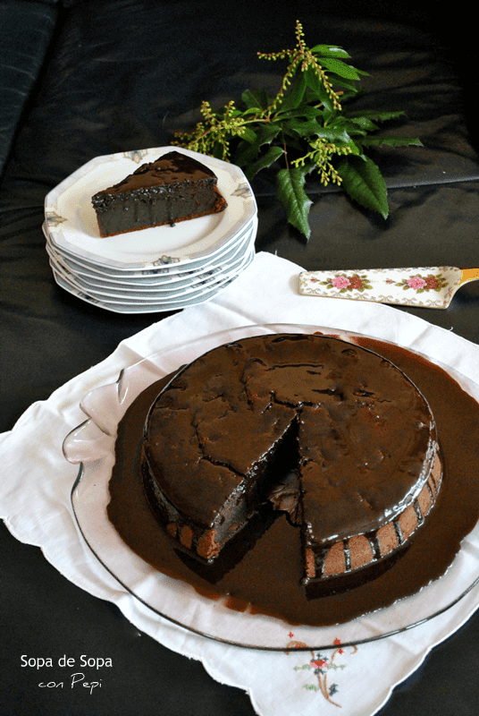 Desmoldar el pastel y ponerlo en un plato grande. Verterle el chocolate por encima hasta que caiga por los bordes.