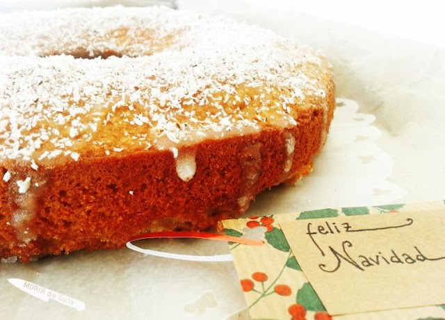 A la carga antes de que acabe el año: un dulce con aires navideños, por lo del coco espolvoreado a modo de copos de nieve. El coco lo aproveché de los restos de hacer leche de coco. ¿Cómo se hace? Muy fácil: pones en el vaso de la batidora la carne del coco con agua. Lo bates, cuelas con tela y ya ¿ves qué fácil?