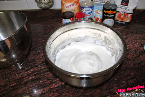Por ultimo falta añadir las claras que teníamos levantadas y el coco rallado estas dos cosas las iremos añadiendo con ayuda de una lengua y con movimientos envolventes para que no se bajen las claras.