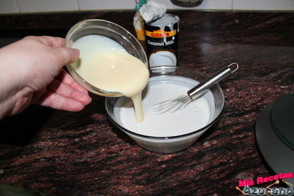 Mientras está haciéndose el bizcocho preparamos el relleno, para ello cogemos la leche condensada y la leche de coco las pondremos las dos juntas en un bol y con ayuda de unas varillas mezclaremos bien, ya tenemos el relleno listo, reservamos.