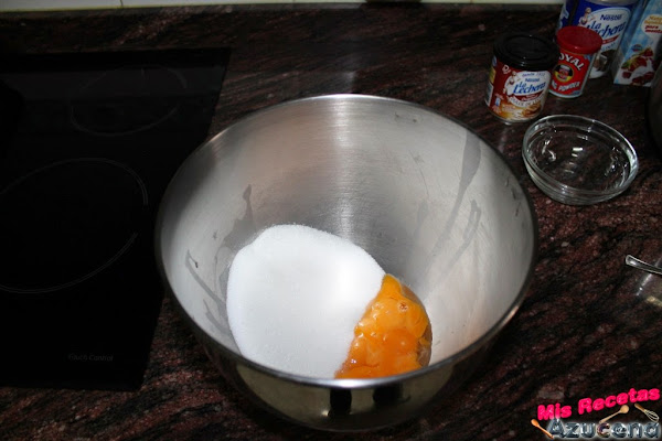 En un bol añadiremos los las yemas y el azúcar, batiremos con ayuda de unas varillas eléctricas o a mano, una vez tengamos las yemas bien batidas añadiremos la nata (crema de leche) y seguiremos batiendo.