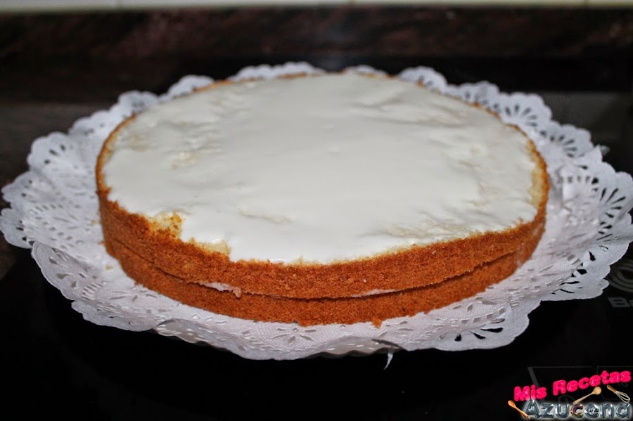 Empezamos, cogemos una bandeja de cartón, encima pondremos una blonda, ponemos la primera parte del bizcocho y le pondremos un poco del relleno, ponemos otra parte del bizcocho y el resto del relleno, por ultimo pondremos la otra parte que nos queda.
