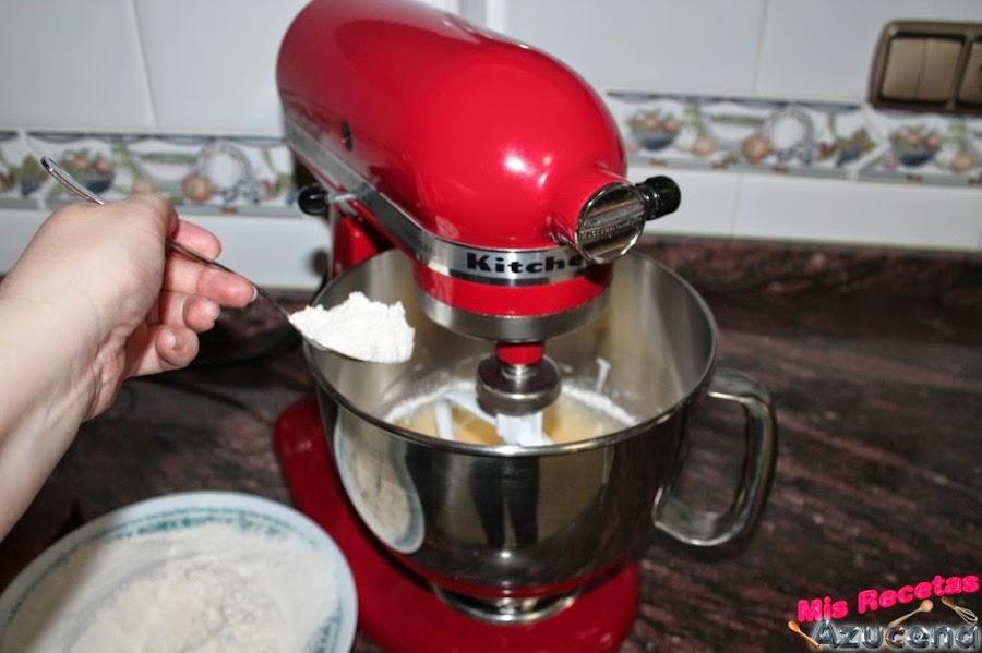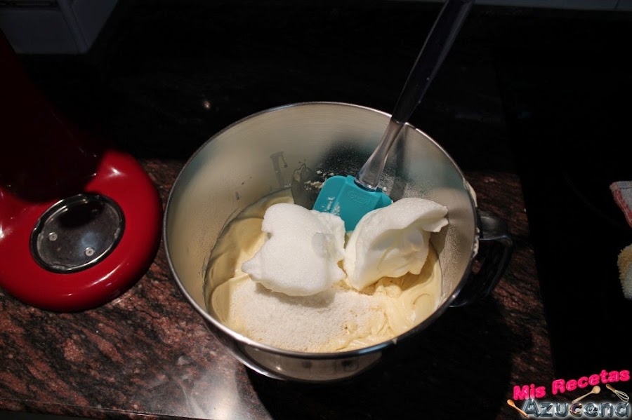Una vez estén los ingredientes del bol bien mezclados e este la masa espumosa iremos añadiendo poco a poco la harina sin dejar de batir.