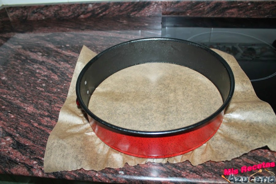 Preparamos nuestro molde untando con mantequilla y un poco de harina, repartimos bien por todo el molde y sacudimos para quitar el exceso. Si tienes espray antiadherente no necesitaras nada de lo anterior, solo le pondremos un poco de spray y listo, yo os aconsejo poner papel vegetal debajo y spray por los laterales para que a la hora de desmoldarlo lo podamos dejar sobre el papel y nos sea más cómodo trabajar.