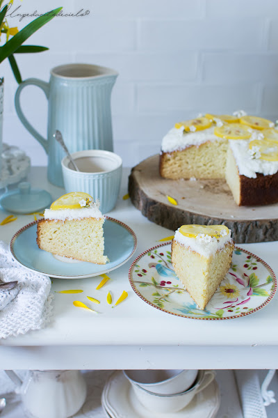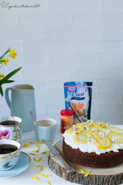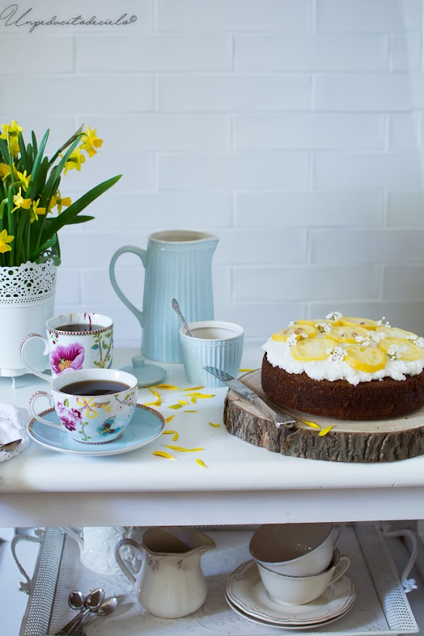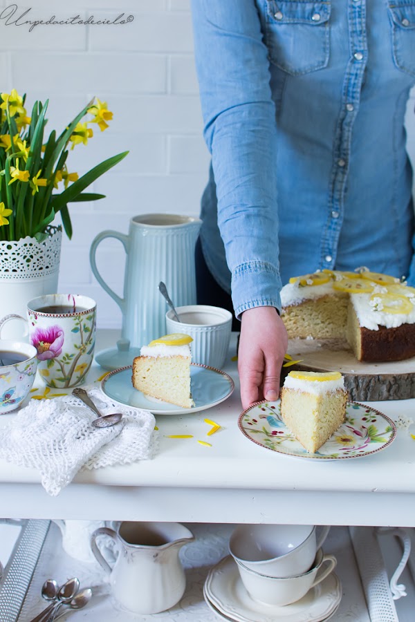 Este pastel me lo suelo llevar a excursiones al campo o viajes, porque al ser un pastel de una sola capa se transporta muy bien, pero además tolera bastante bien los 25 grados de estas fechas, ya que el frosting es coco, limón y azúcar glas.