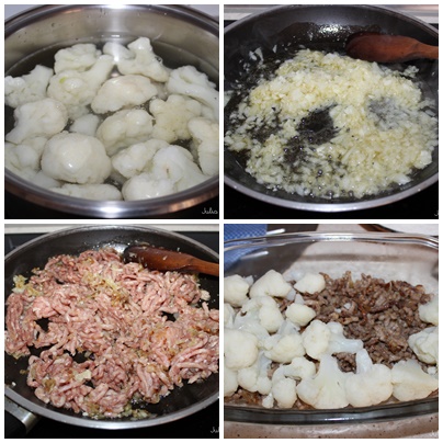 En una fuente de horno ponemos en la base la carne picada. Encima ponemos la coliflor cocida.