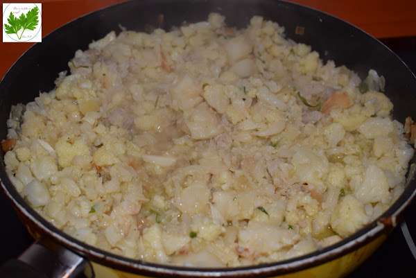 Pon agua en una cacerola, 1 cucharadita de sal y pon la coliflor troceada. Si lo prefieres puedes cocerla al vapor ( yo la cuezo al vapor o en microondas y es más de mi gusto pues se conservan más los sabores ). Una vez esté tierna, pero con consistencia, al dente más bien, saca del agua y escurre. Reserva.