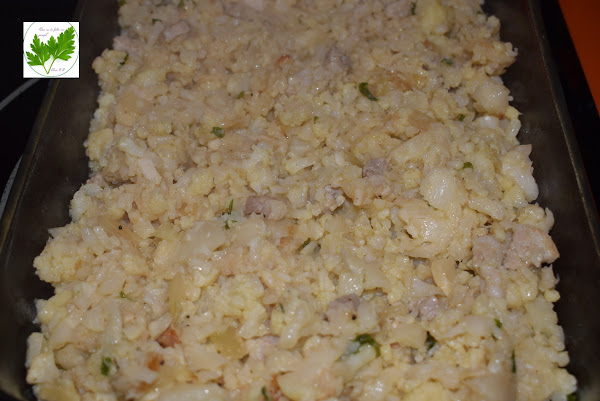 Unta una fuente apta para el horno con un poco de mantequilla y agrega la coliflor rehogada.