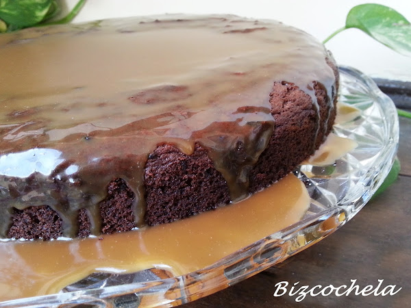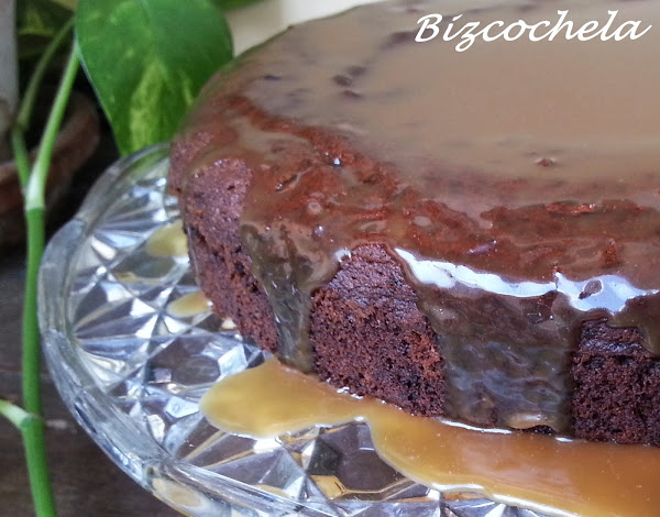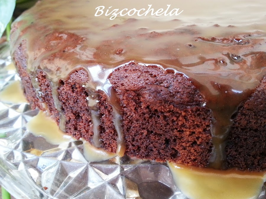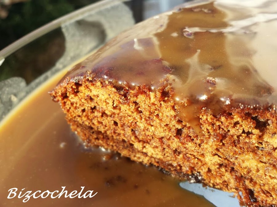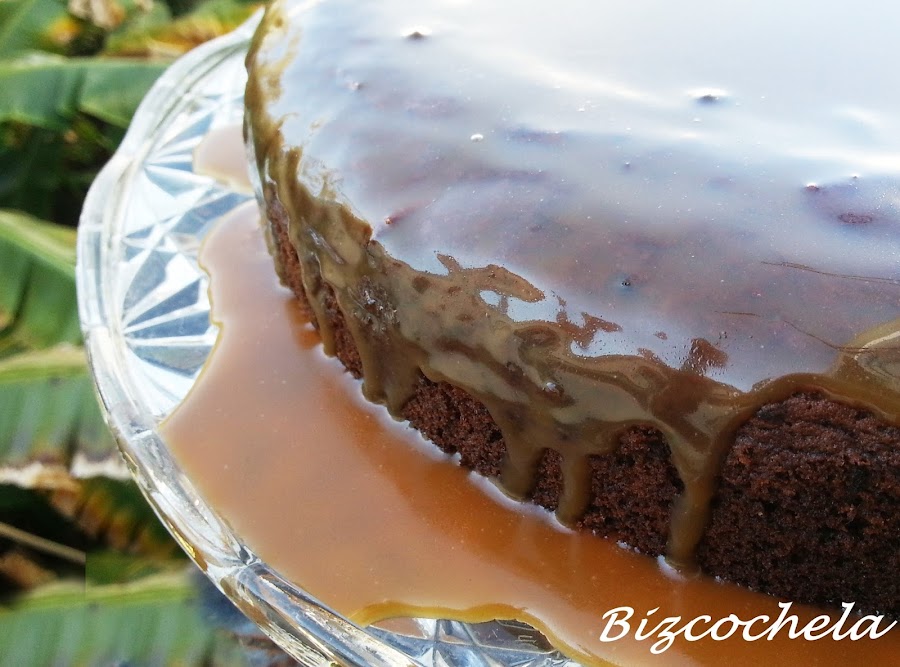 Solo queda sacar el bizcocho del horno y dejar que enfríe. Desmoldamos y cubrimos con la salsa.