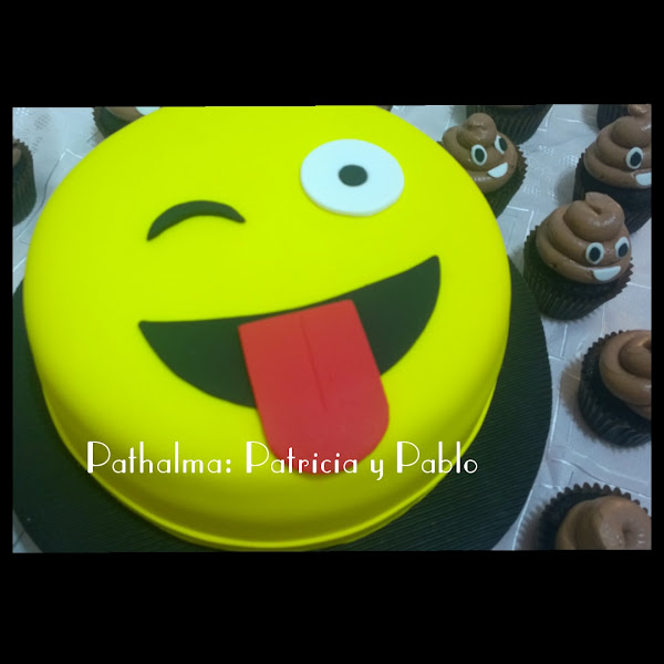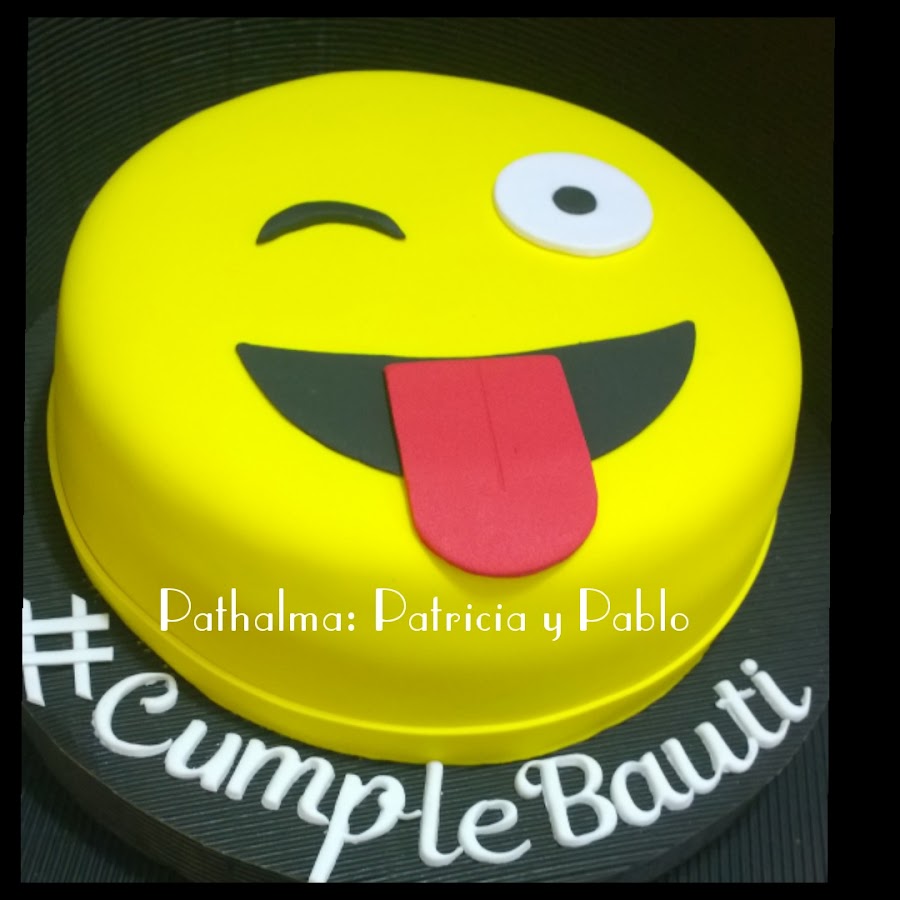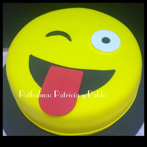 hoy compartimos nuestra torta emoji, Feliz... la misma esta forrada en fondant amarillo, con apliques de los ojos boca y lengua en pasta para modelar ....