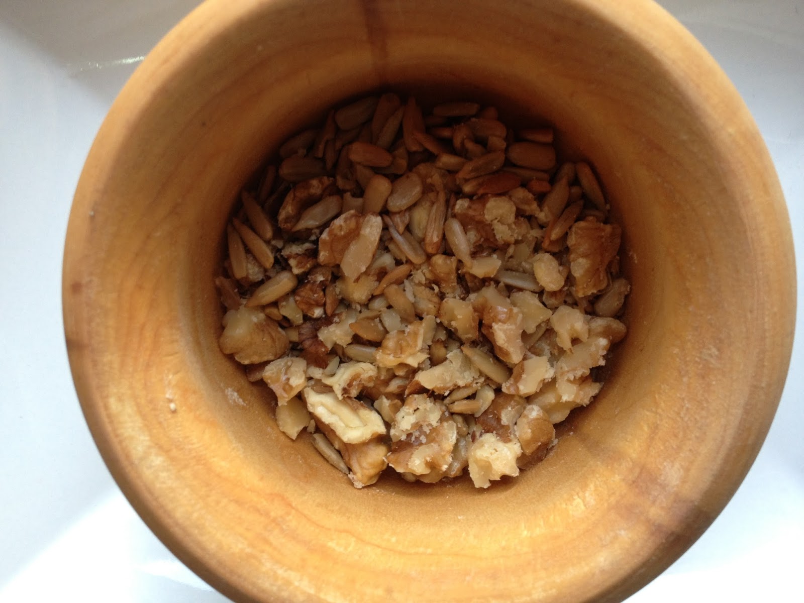 8 Finalmente en un mortero añadimos los 10 gr de pipas peladas y los 20 gr de nueces , los rompemos para evitar tener trozos excesivamente grandes .