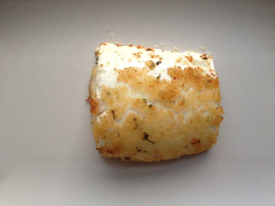 9 Ya solo queda emplatar , cortamos en 2 el trozo grande de queso de Burgos empanado y colocamos los dos trozos separados.