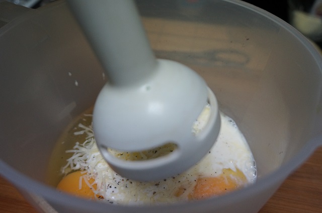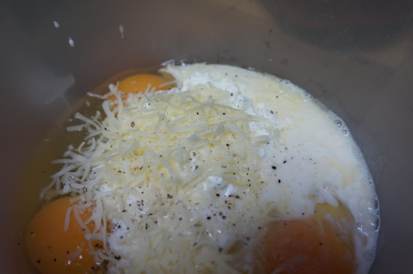 Por otro lado preparamos la mezcla de la tarta. Ponemos en un bol los huevos, el queso batido, queso rallado, la leche evaporada un poco de sal y pimienta.
