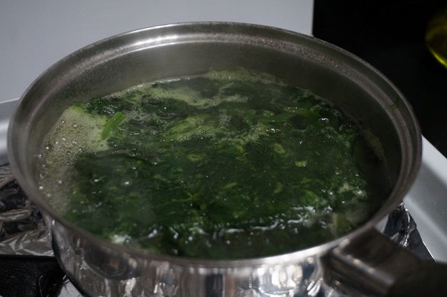 Empezaremos con las espinacas, si son frescas las lavamos y las salteamos en una sartén o las ponemos a cocer. Yo he utilizado congeladas, las he puesto cocer con abundante agua, cuando ha empezado a hervir las he dejado 5 minutos.