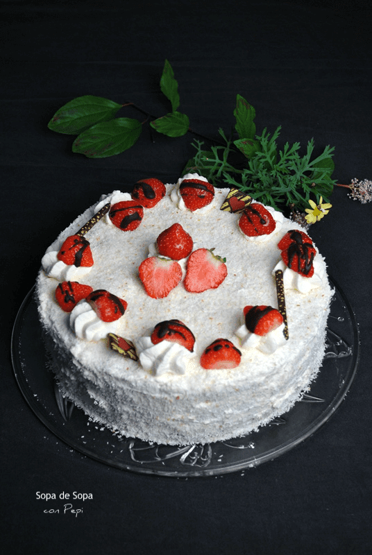 Sacar el aro del bizcocho y cubrir por completo el pastel con la nata montada (crema de leche). Espolvorearlo cubriendolo todo con el resto del coco rallado.