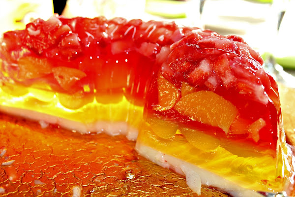 Quería estrenar un molde "Nordic Ware" que me regalaron unas amigas y al ser rígido me costó lo mío desmoldarlo. Mientras iba añadiendo capas de gelatina, sabía que me daría problemas pero ya era demasiado tarde para rectificar.