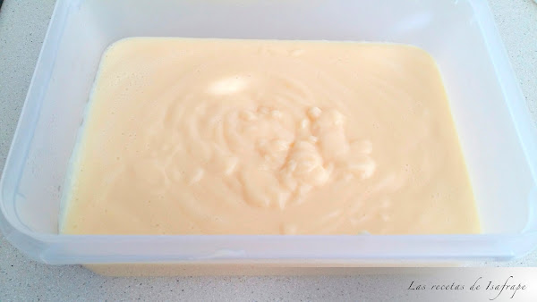 Incorporamos la leche y lo removemos todo bien. Ponemos esta mezcla en un cazo al fuego sin dejar de remover. Cuando comience a hervir veremos como espesa, entonces apartamos del fuego, volcamos en un táper y dejamos que se enfríe. Reservamos.