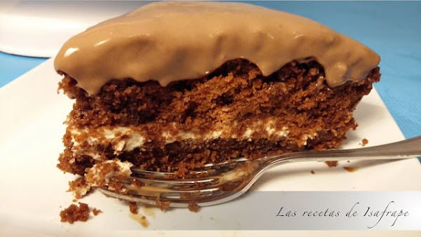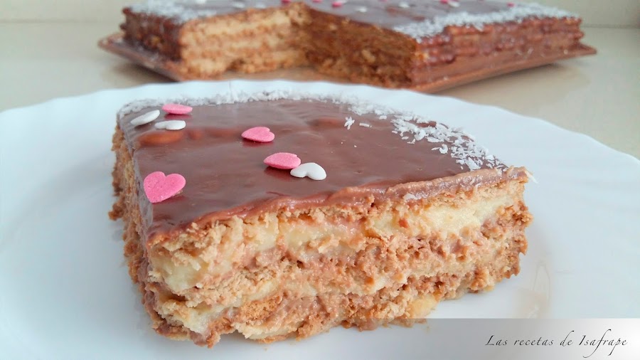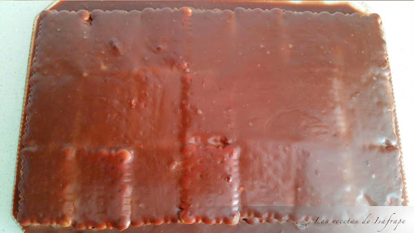 Vamos alternando capas de galletas, crema y chocolate hasta terminar con chocolate. Salen tres capas de cada sabor, incluida la cobertura. Dejamos reposar en el frigorífico y adornamos al gusto.