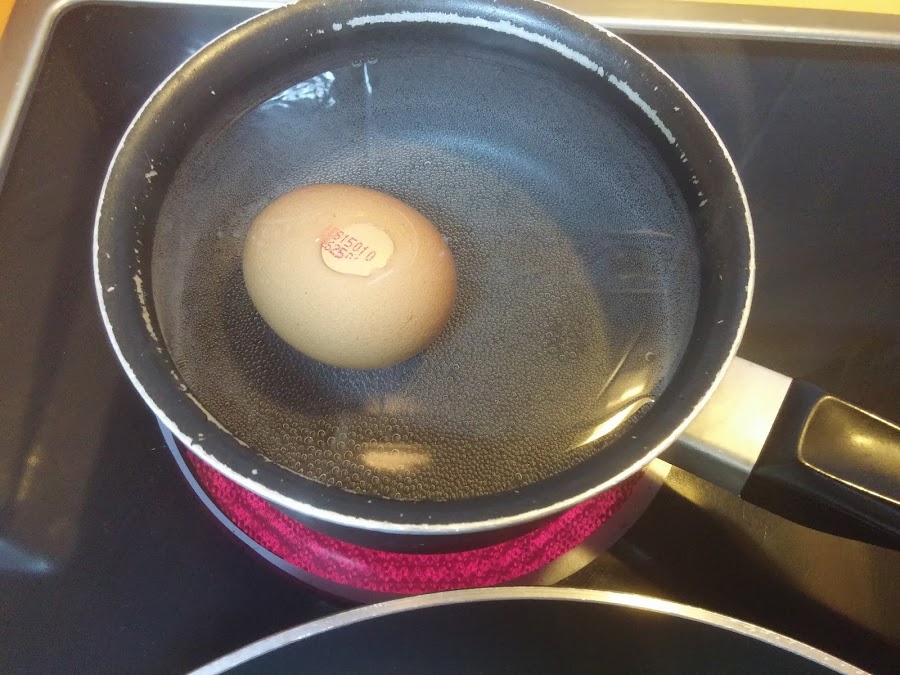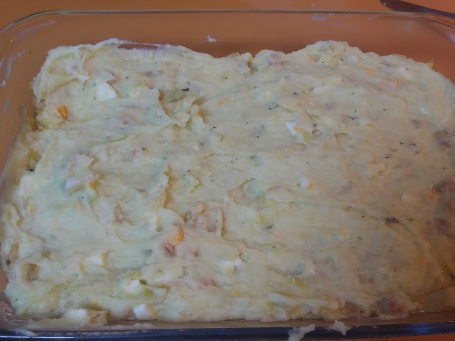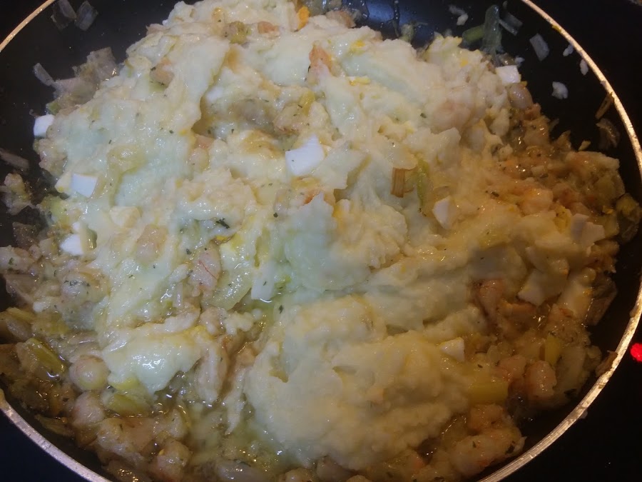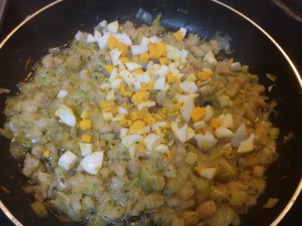 Cuando el sofrito esté listo añadimos el huevo cocido picado. Ponemos a precalentar el horno.