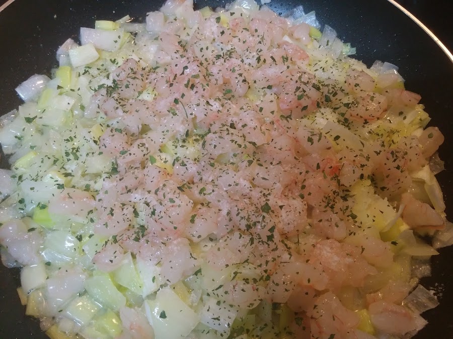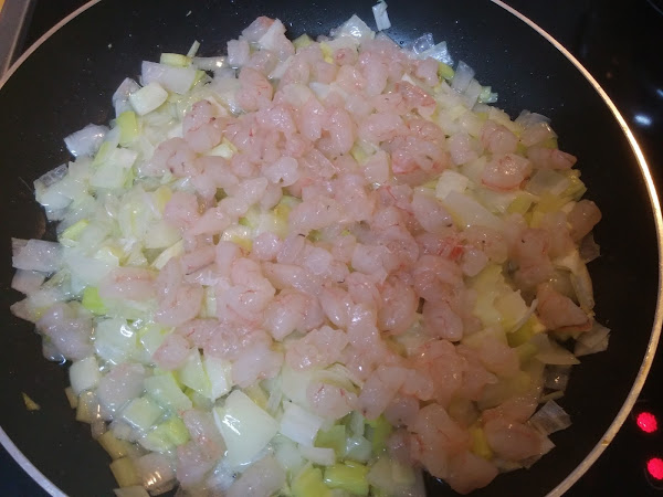 A los 5 o 6 minutos añadimos las gambas ya descongeladas y cortadas en trocitos.